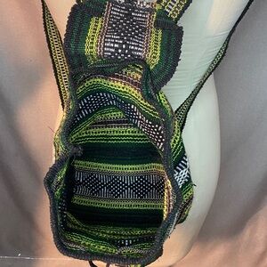 Beautiful small woven backpack crafted in Mexico, featuring a striking boho pattern in green, black, brown, and white tones. Made from thick woven fabric with traditional Mexican textile detailing. The bag has woven straps, a drawstring closure with tassels, and a roomy main compartment—perfect for casual outings, festivals, travel, or everyday use.