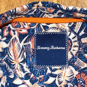 Short sleeve button front shirt by Tommy Bahama. Size XL and 100% silk. Blue with tropical floral print in white/orange In excellent used condition with no holes, tears, or stains. Comes from a smoke free home.