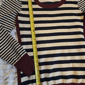 Stylish sweater with burgundy and cream stripes. Soft and comfortable fabric. Perfect for casual wear.
