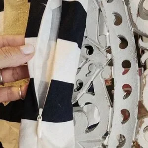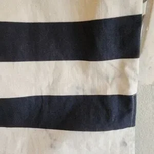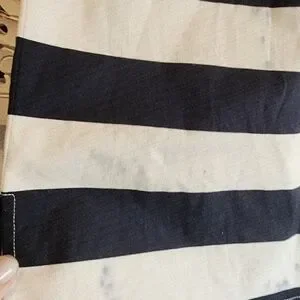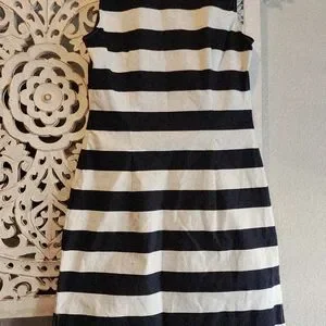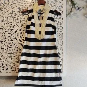 The Sail to Sable dress is a striking black and white sheath mini, perfect for casual or work settings. It features a sleeveless design with a unique bib collar that adds a touch of sophistication. The form-fitting silhouette and classic stripe pattern make it a timeless addition to any wardrobe. New without tags, stain in the bottom front and back see pictures for reference