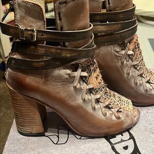 Stylish lace-up boots with a snakeskin pattern. Features open toe and unique design.