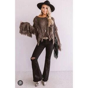 Womens Sweater S/M Brown Cropped Fringe Cable Knit Boho Pullover Oversized Rodeo
