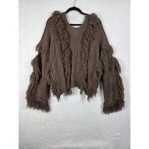 Love Sweater Womens S/M Brown Cropped Fringe Cable Knit Boho Pullover Oversized Grunge