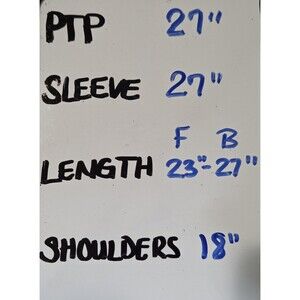 Measurements: PTP 27 in, Sleeve 27 in, Length 23-27 in (front to back), Shoulders 18 in.
