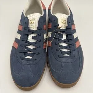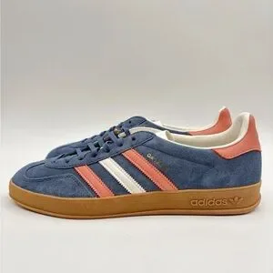 Elevate your look with these Adidas sneakers. Blue suede with coral accents. Comfortable and stylish for any occasion.