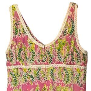Vintage Lilly Pulitzer Shift Boho Crochet Edging Midi Dress 12 Ruffle Vacation. This dress is fully lined, has a zip back and the pattern is pink and green animals and florals. It is made of 100% Cotton. It measures, Underarm to Underarm 16". Length 44". This dress is in great, used condition. Ships from a Smoke Free Home. Any questions, please ask. All reasonable offers welcome.