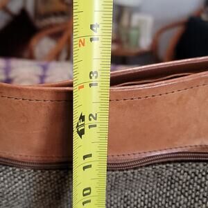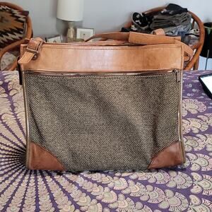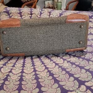 2 external zipper pockets - adjustable cross body strap - leather and tweed - good vintage condition - brass buckles and feet - very nice