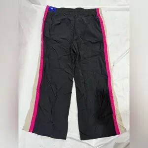 JoyLab two-piece colorblock track suit set in size S. Includes a lightweight half-zip windbreaker jacket with hood and matching straight-leg athletic pants. Stylish black design with sporty pink and beige contrast panels.