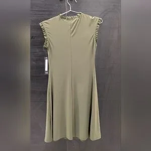 Stylish olive green mini dress with ruffle sleeves. Ideal for versatile wear.