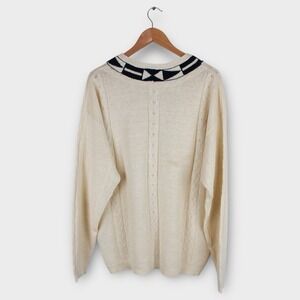 Nautica Vintage White Cable Knit V-Neck Sweater Geometric Trim Men's Large