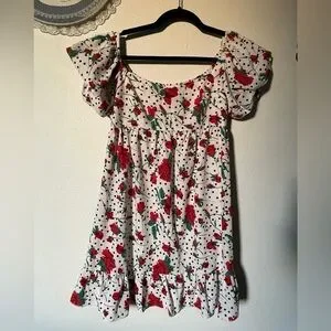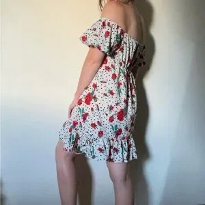 Embrace elegance with this off-shoulder floral dress. Featuring a vibrant red floral pattern & black polka dots on a classic white background.