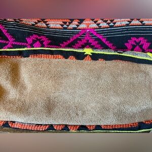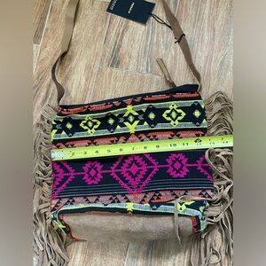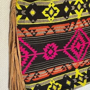 Suede fringe and bottom. Adjustable leather strap. Dun pattern in bright pink, orange, yellow and black. Will go with just about every outfit! Inside is one large pocket with one small zippered pocket.
