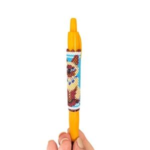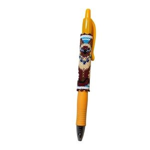 This fun beaded pen wrap celebrates the beauty and majestic nature of the beloved Siamese cat breed. This particular cat is sitting quietly, staring straight ahead and is wearing a beautiful jeweled color, as is his due, of course, being the regal and royal animal that he is. This pen wrap can be easily removed and put on other G2 pilot pens. For added fun and uniqueness this pen has beige/gold/yellow ink in a limited edition color — which is reflected in the color of the pen, and it’s showing the last listing — but I can easily change it to a classic blue or black color pen and ink color upon request.