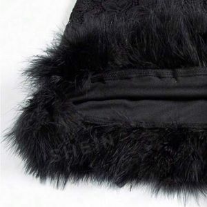 Step out in style with this elegant black lace dress. Featuring a chic feather hem, it's perfect for any special occasion. The intricate lace design adds a touch of sophistication.