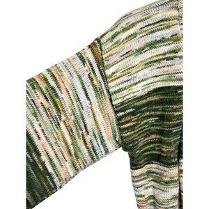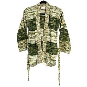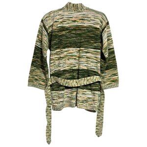 Soft knit cardigan with a belted waist and an earthy green and cream pattern. Comfortable and machine washable, ideal for layering. The tie at the waist is approximately 50" long.