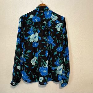 Size Large Chic blouse with vibrant blue & green floral design. Stylish and versatile.