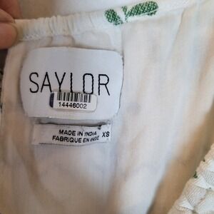 Keywords: SAYLOR dress, women's mini dress, XS dress, embroidered dress, gauze dress, puff sleeve dress, tie neck dress, white blue green dress, boho dress, summer dress, casual dress, designer dress, resort wear, lightweight dress, bohemian, country, cowgirl, rodeo