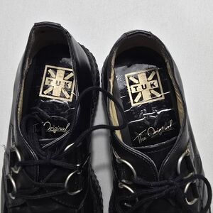 Tuk The Original Black Leather Platform Shoes Size 6. Good pre-owned condition. Leather upper Man made sole. See photos for details. Men's size 6 which is equivalent to Women's size 8.