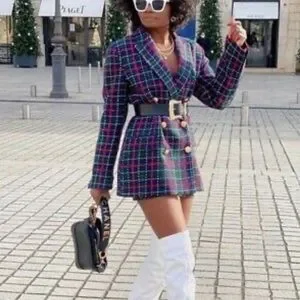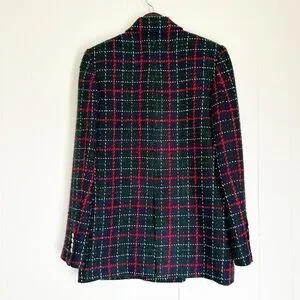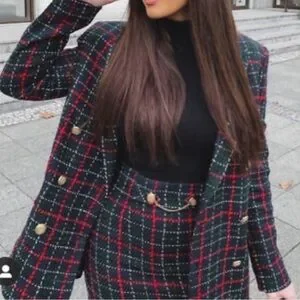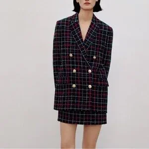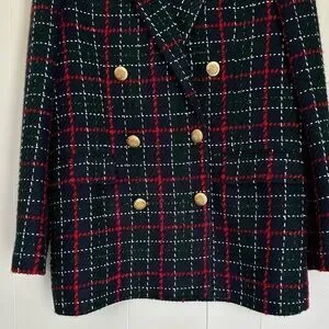 ZARA Tweed Plaid Double Breasted Blazer Green Red Gold Buttons