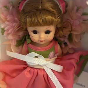Charming doll in pink dress with green trim. Features delicate flower accents. Perfect for imaginative play. Mint condition in box