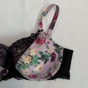 Fun and sexy bra from Torrid features a black lace base with contrasting pink satin cups and floral print. Double hook and eye closure, adjustable straps. Excellent condition. Size 38DD