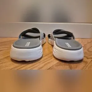 Excellent condition, Skechers comfort and a versatile color! These sandals are lightweight and can be worn for hours on end. Pretty silver metallic straps give them a little "extra".
