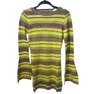 knit mini dress, striped dress, open back dress, lace-up back, long sleeve dress, retro dress, vintage knitwear, Y2K fashion, fall outfit, cozy sweater dress, multicolor knit, ribbed mini dress, bell sleeve dress, aesthetic dress, 2000s inspired dress