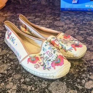 GIANNI BINI ladies flat floral crocheted espadrilles slip on preowned very good condition size 8 1/2