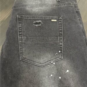 Black jeans with unique white detailing. Features a modern, edgy design.