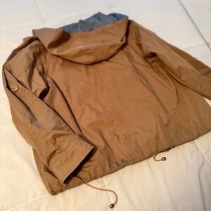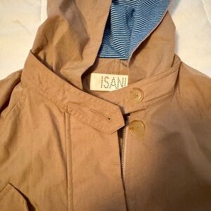 Light weight tan hooded jacket from Isani sold at Anthropologie. Great condition, features a contrasting blue and white striped inner lining in the hood. Nice layering piece for fall!