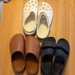 Versatile CROCS for women. Includes white clogs, brown Dylan slip-ons, and black platform sandals. Gently used women's 10