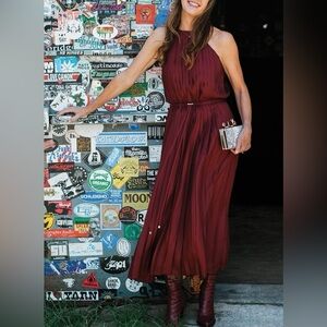 Dark red silk Mendini twill pleated dress from Tibi featuring a halter neck, a sleeveless design, a drawstring waist and a long length.
