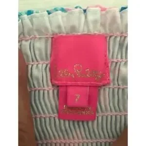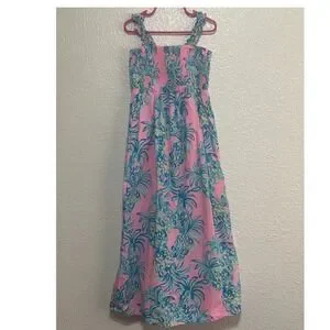 Keywords: Lilly Pulitzer Kids, girls dress, smocked dress, pineapple print, pink dress, blue dress, size 7, summer dress, vacation dress, kids clothing, resort wear, party dress, casual dress, cotton dress