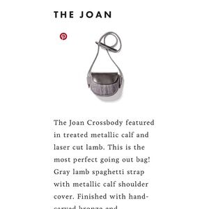 The Joan Crossbody featured in treated metallic calf and laser cut lamb. This is the most perfect going out bag! Gray lamb spaghetti strap with metallic calf shoulder cover. Finished with hand-carved bronze end caps. Exterior back pocket (for easy phone access), interior zipper pocket and muted gold lining.