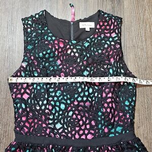 This stunning Wolven dress features a sleeveless, fit-and-flare silhouette with a crew neck, perfect for cocktail events. The elegant black lace overlay is beautifully contrasted by a vibrant pink underlay, creating a sophisticated and eye-catching look. Its midi length and intricate cutout details add a touch of modern elegance to this timeless piece.