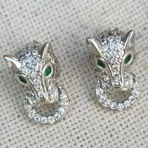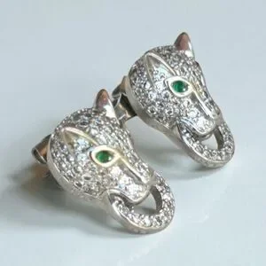 gorgeous sterling silver pave rhinestone art deco style panther earrings with green gemstone eyes. no missing stones.