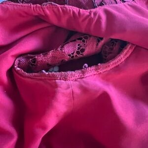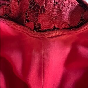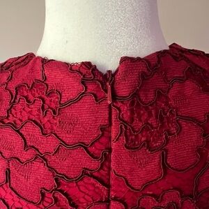 Chic red lace midi dress with floral pattern. Beautifully made. Long sleeves add elegance. Perfect for special occasions. Worn twice. Slight marks at underarms inside dress (see pics). Otherwise pristine condition.