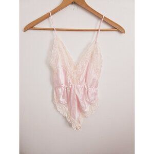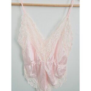 Vintage Teddy Lingerie Silky Satin Lace Pink Ms Leslee V-Neck Bodysuit L Large