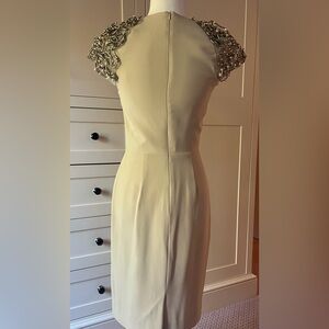 Chic and stylish midi dress by Lela Rose. Worn once. Beautiful beading at shoulders. Sample piece- sizing is a 4/6. Features a soft cream color satin lining. Slight wear at underarms. 1 small pull in fabric and 2 small spots shown. Perfect for elegant occasions.