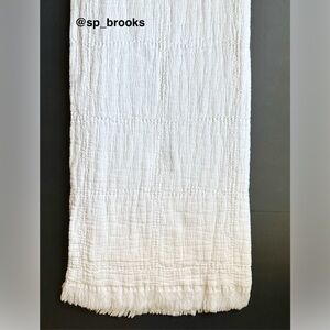 Beautiful matelassé textured throw blanket in a smocked square pattern in white with loose ivory fringes. This Made in Portugal throw blanket is oversized and exudes traditional yet modern elegance and charm.