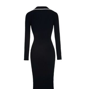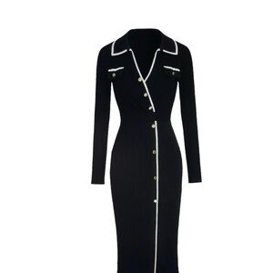 Chic black dress with long sleeves. Features gold buttons and white trim. Ideal for stylish occasions.