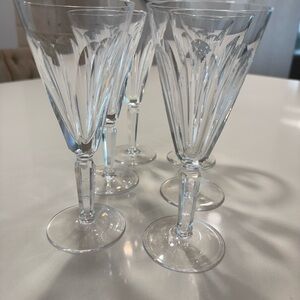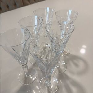 Six Waterford Crystal "Sheila" water glasses, clean and in excellent condition. Sheila is a discontinued pattern made 1958-2017. > Etched "Waterford" on bottom of the base. > Modern design with a smooth bowl that has six cuts around the lower part.
