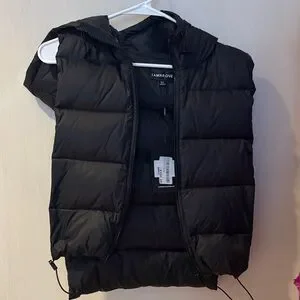 Sleek black puffer vest. Features a hood and zip closure. Perfect for layering.