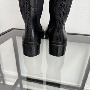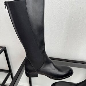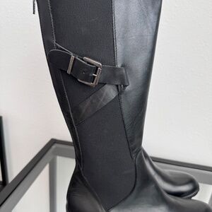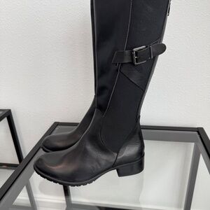 CHARLES DAVID made in Italy women’s black leather tall stretch riding boots Size 7 NWOB. Back zipper makes for easy on and off, stretch and buckle, stylish, classic and good quality.