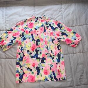 Bright and cheerful, this lightweight blouse features a colorful all-over floral print in pink, navy, and green tones. It has a smocked high neckline with a little v-neck, 3/4 length sleeves with elastic cuffs. Condition is like new. Smoke free home. Offers welcome!!