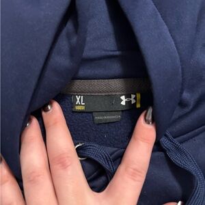 Navy blue under armour Norte Dame Football Sweatshirt, has a kangaroo pocket and drawstring hood. No flaws and no stains