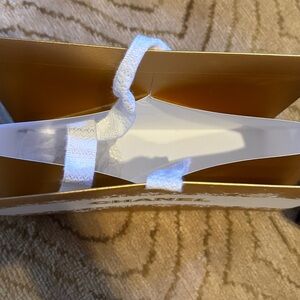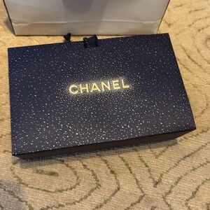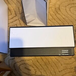 Sophisticated Chanel box in white with black detailing. Ideal for gifting. box is 8.75 by 4 inches high all together 6 items. 5 bags assorted sizes and the box