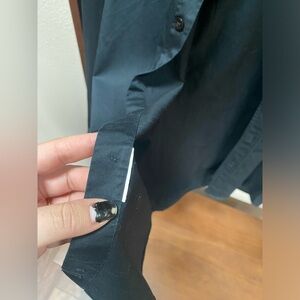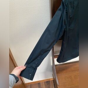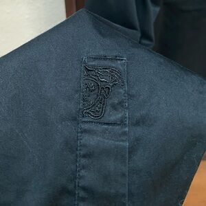 Shirt features embroidered logo on back of left wrist and embossed name on buttons. The fabric tag was cut out because of where it hit on the stomach but I believe it was 100% cotton