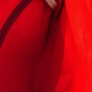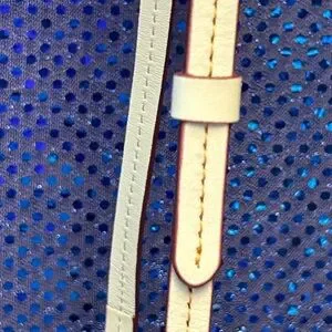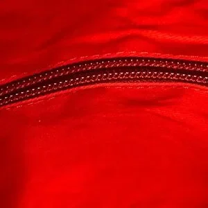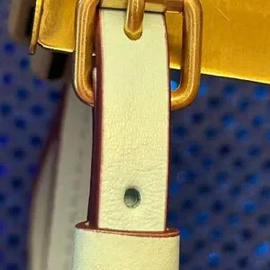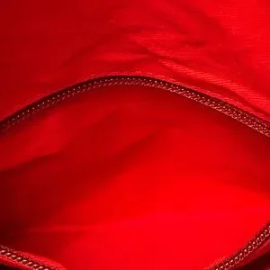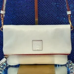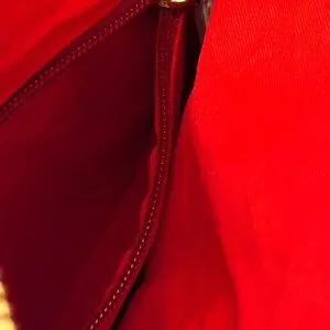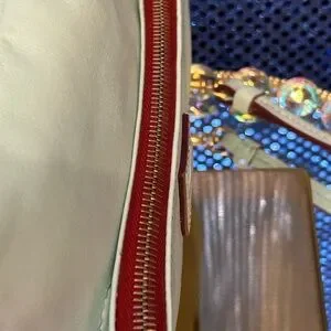 Elegant white crossbody bag with logo detail. Perfect for any occasion. The back has an open pocket. The front closes with a magnetic flap that has a top zipper. The zipper has a tassel on the pull tag. Under the flap there is a pocket that has 6 cardholders. The interior material is red cloth. The zipper is red. All metal is gold-tone. There is a detachable, adjustable crossbody strap that is approximately 25” long.