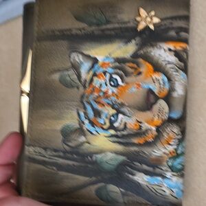 Discover the artistry of this hand-painted leather wallet featuring a striking tiger cub look at all that detail each one is a one of a kind because the strokes of the artist paintbrush are never exactly the same. this signed tagged with a story on how these paintings are brought to life. real leather these last a long time so weather it's for everyday use or as a display plan on having this wallet for many years.